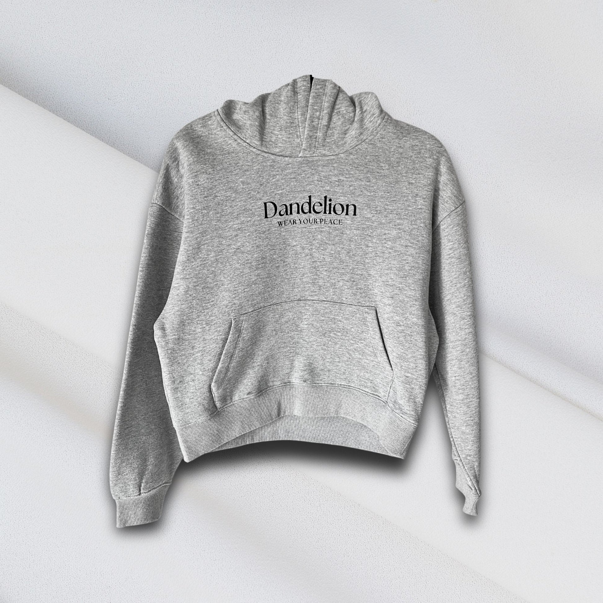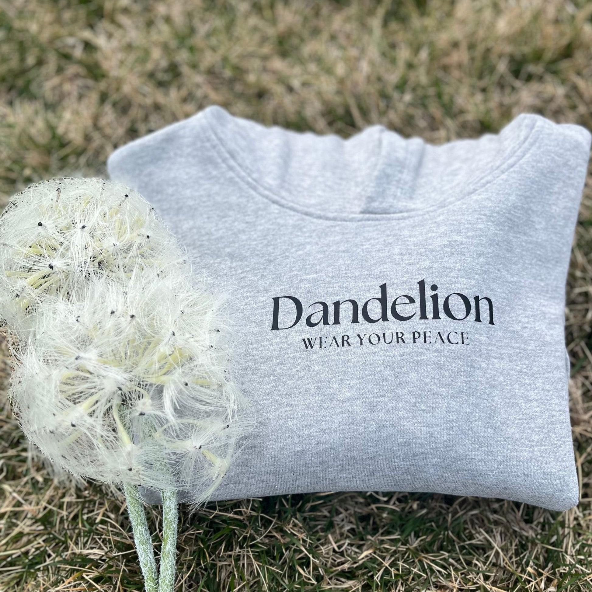The front design reads Dandelion – WEAR YOUR PEACE in matte black vinyl, applied by hand using heat press. On the back, the floral DTF artwork paired with the phrase Wear your peace adds a calming presence and emotional resonance. Every design you see — from DTF to vinyl — is carefully chosen and applied by us in-house using DTF, vinyl, and heat press techniques.