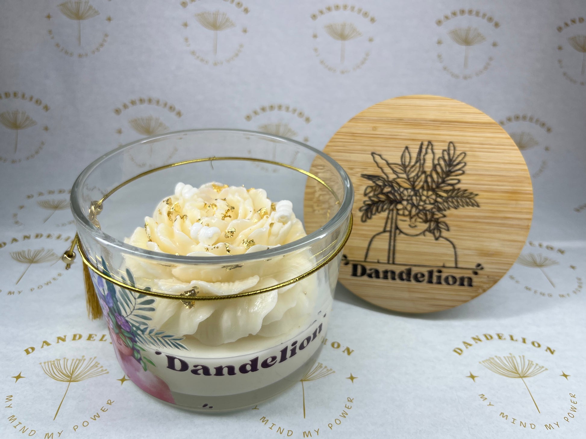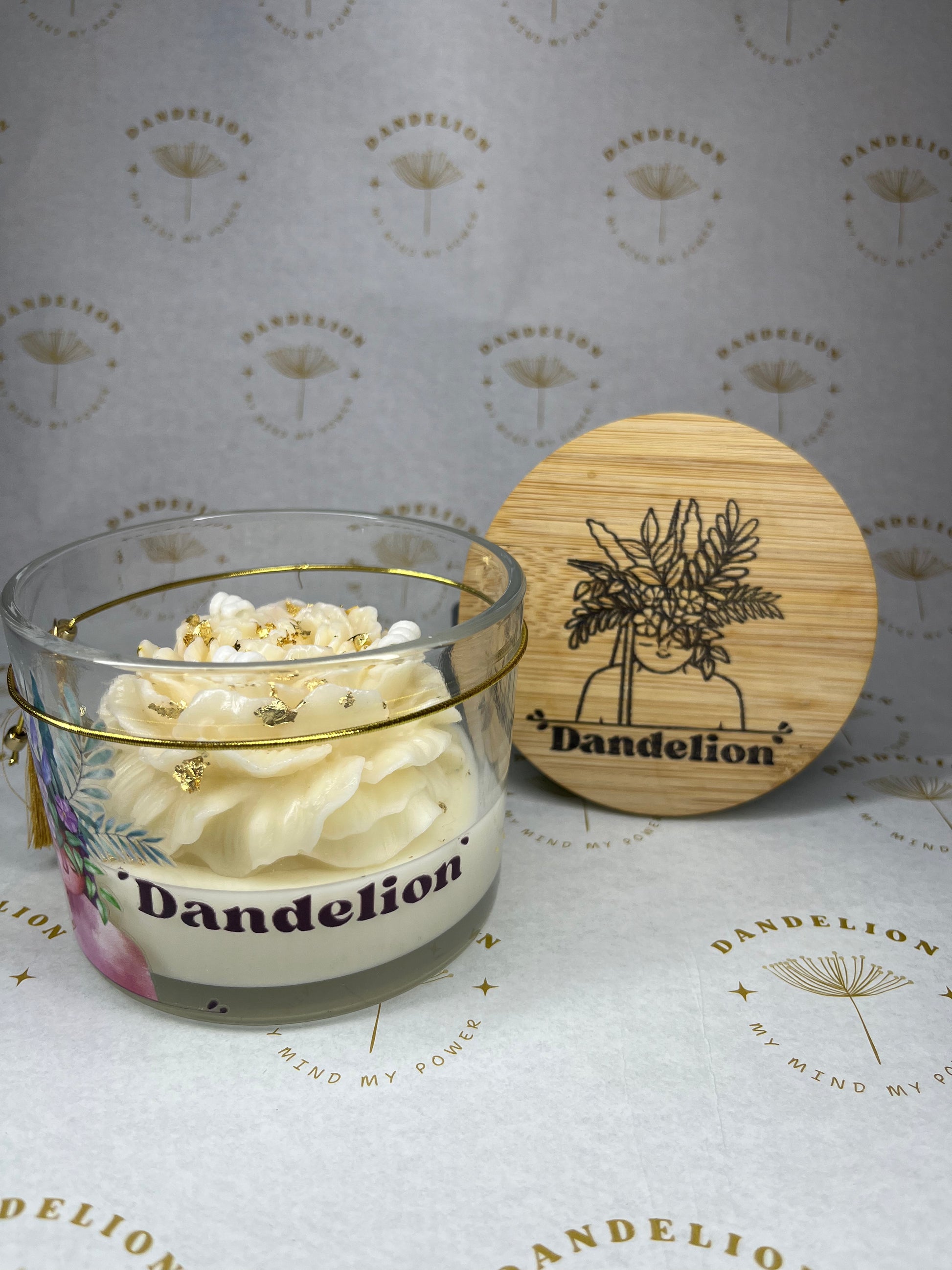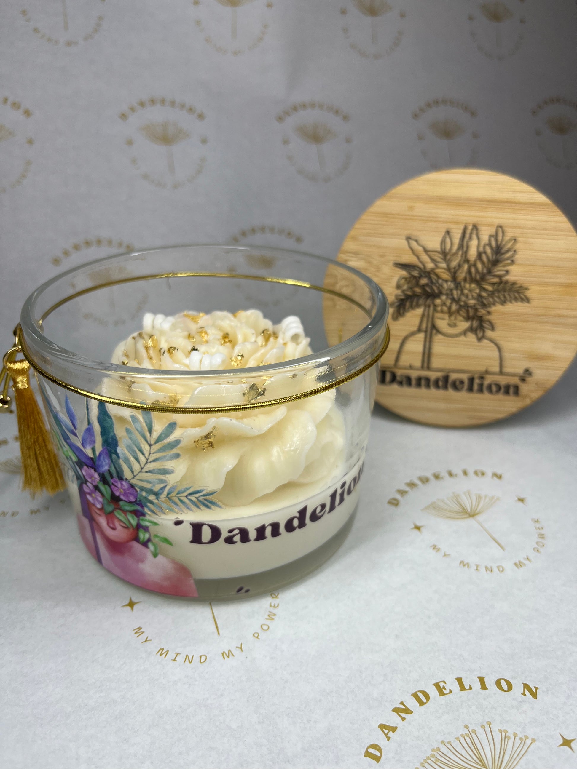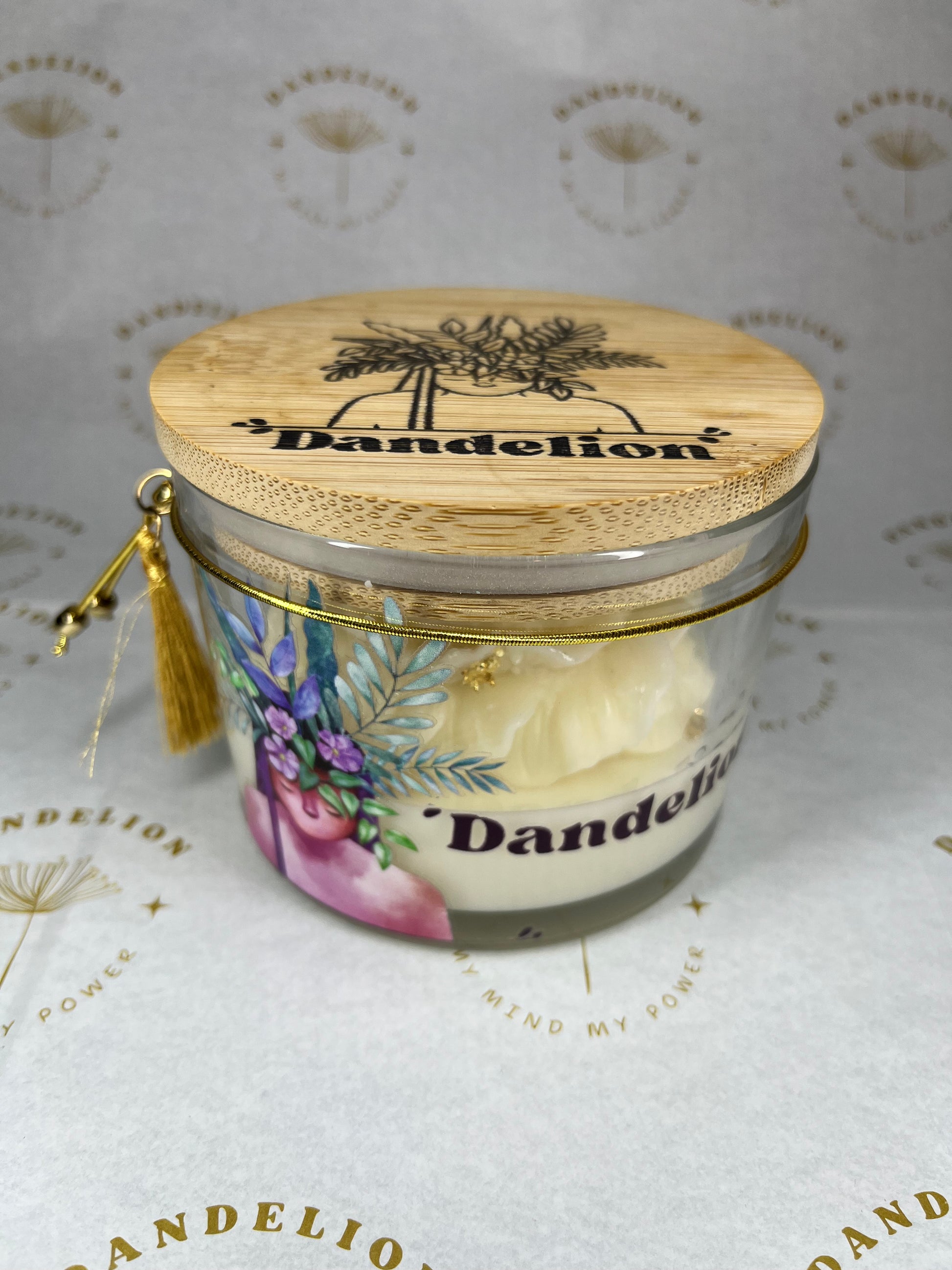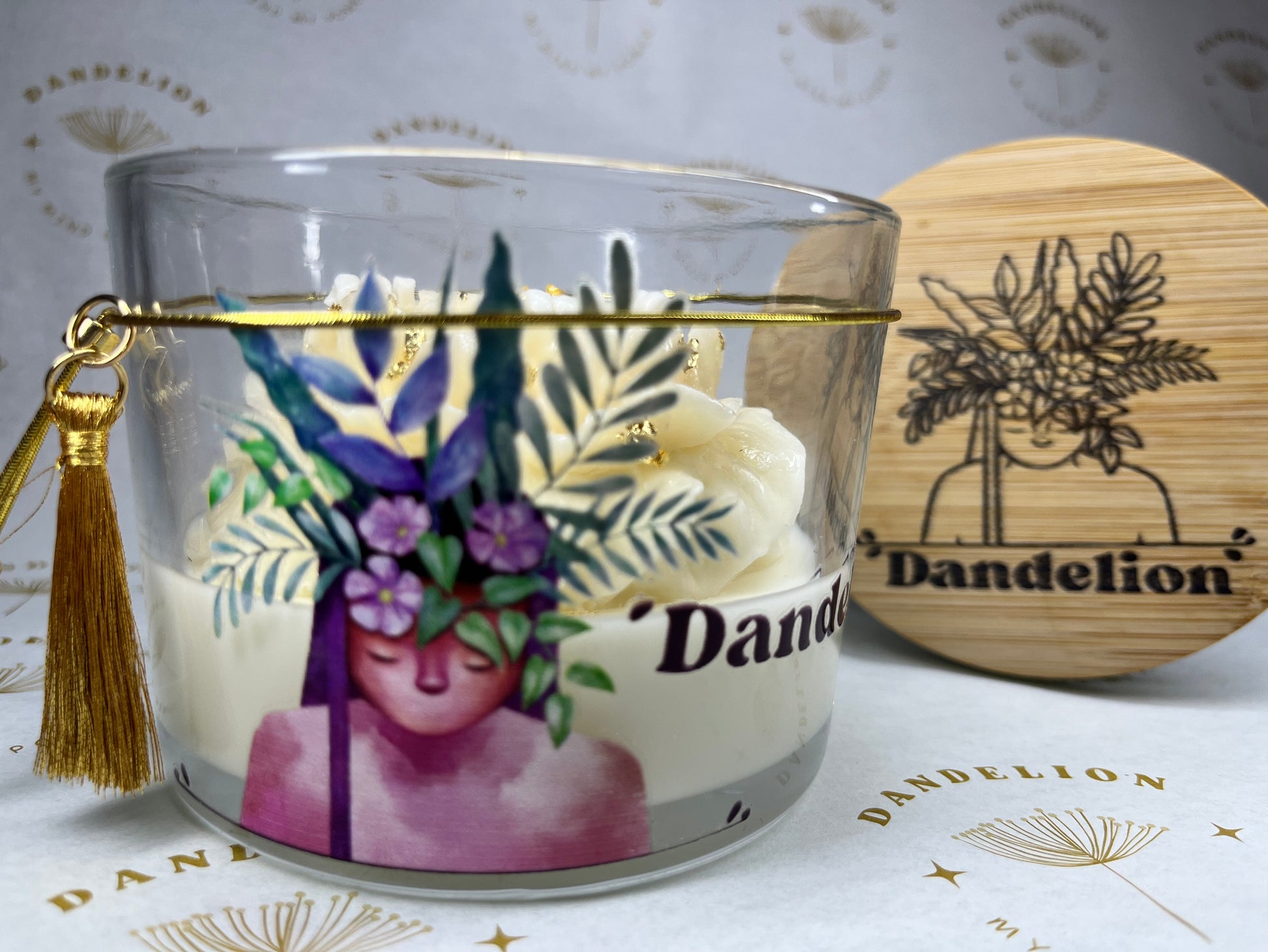 The jar is a piece of art itself: thick glass adorned with an original Dandelion design of a serene woman crowned with leaves and purple flowers, sealed with a bamboo lid engraved with the Dandelion logo and finished with a golden tassel ✨🌸.