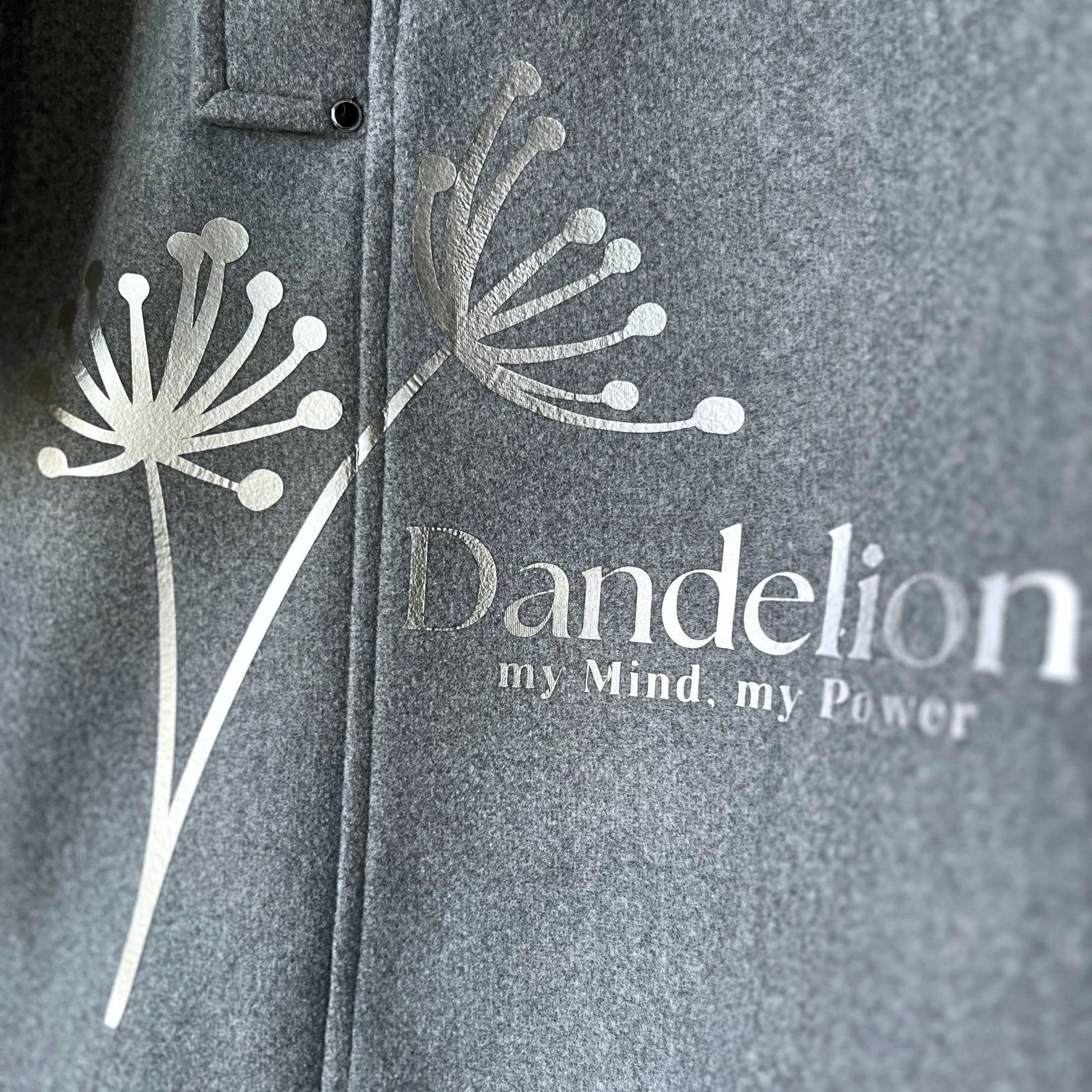 This coat features handcrafted vinyl designs in a metallic silver tone. On the front, two elegant dandelions accompany the phrase “Dandelion. my Mind, my Power”. On the back, the same message appears again along with “WEAR YOUR PEACE”, subtly placed across the waist.