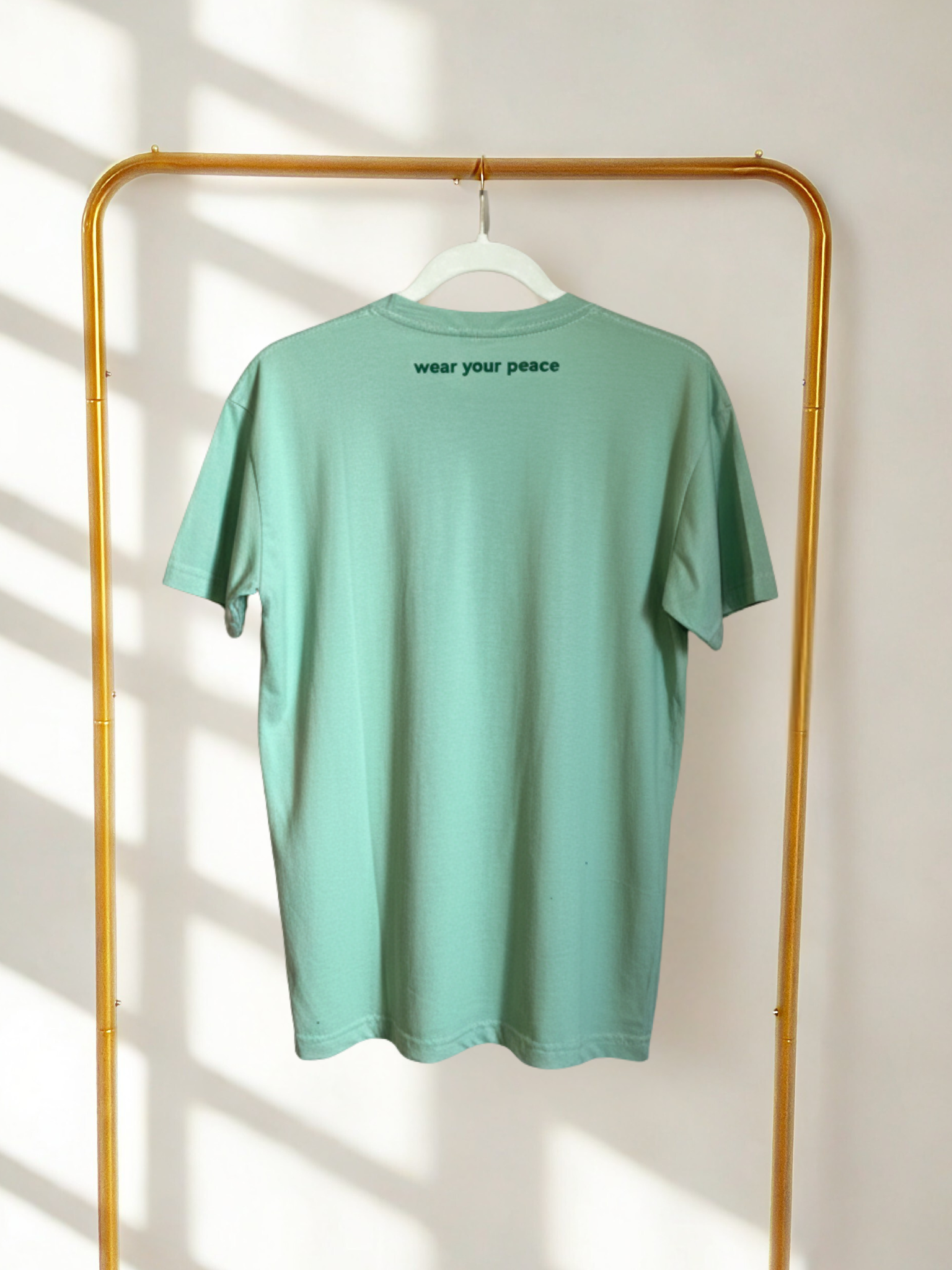 On the back, hidden inside the neckline, you’ll find the phrase “wear your peace.”