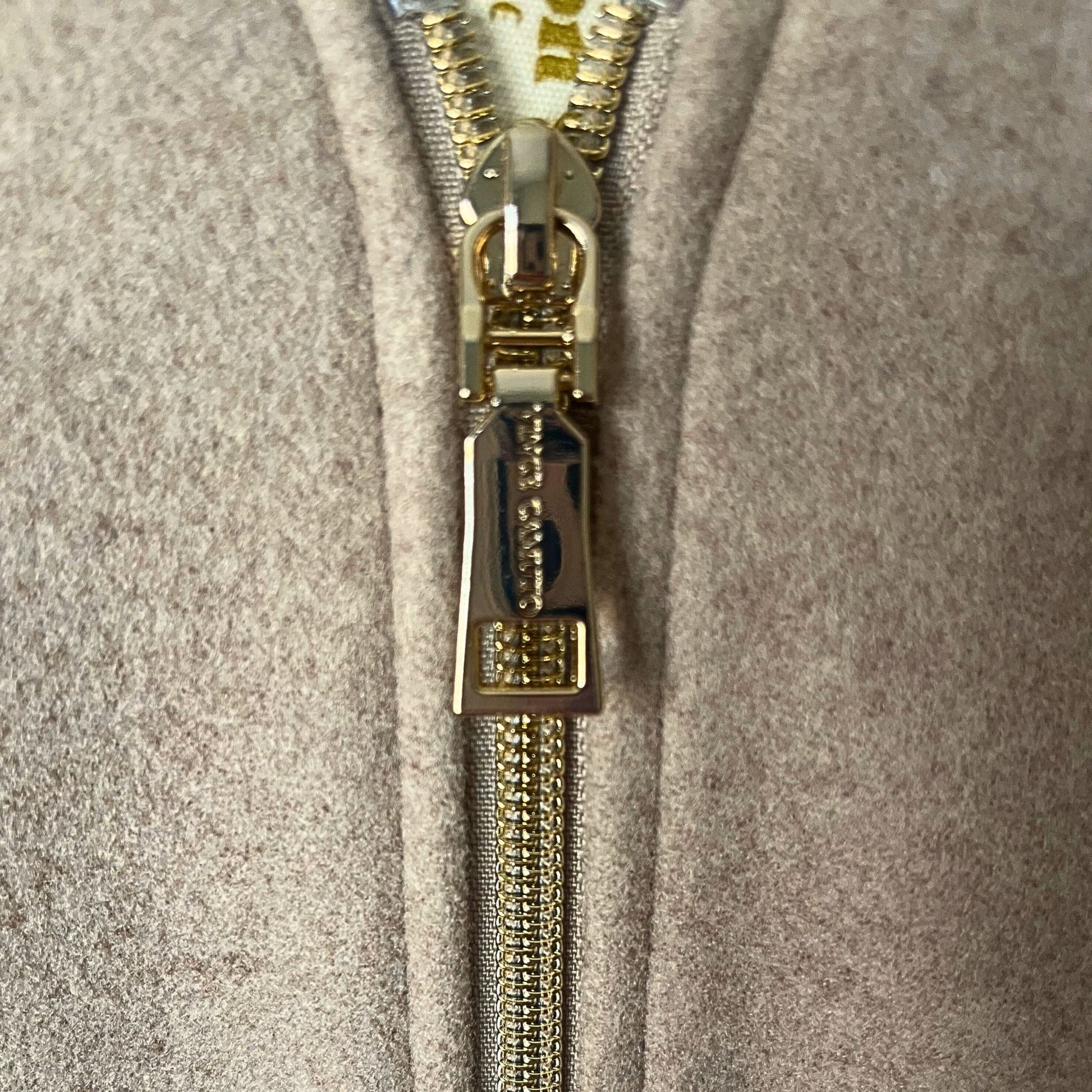 This elegant light brown coat blends structure with softness. The felt-like texture feels warm yet lightweight, and the tailored design gives it a graceful silhouette. It features a full gold-tone zipper, a hood for extra comfort, and two side pockets with subtle metallic accents.