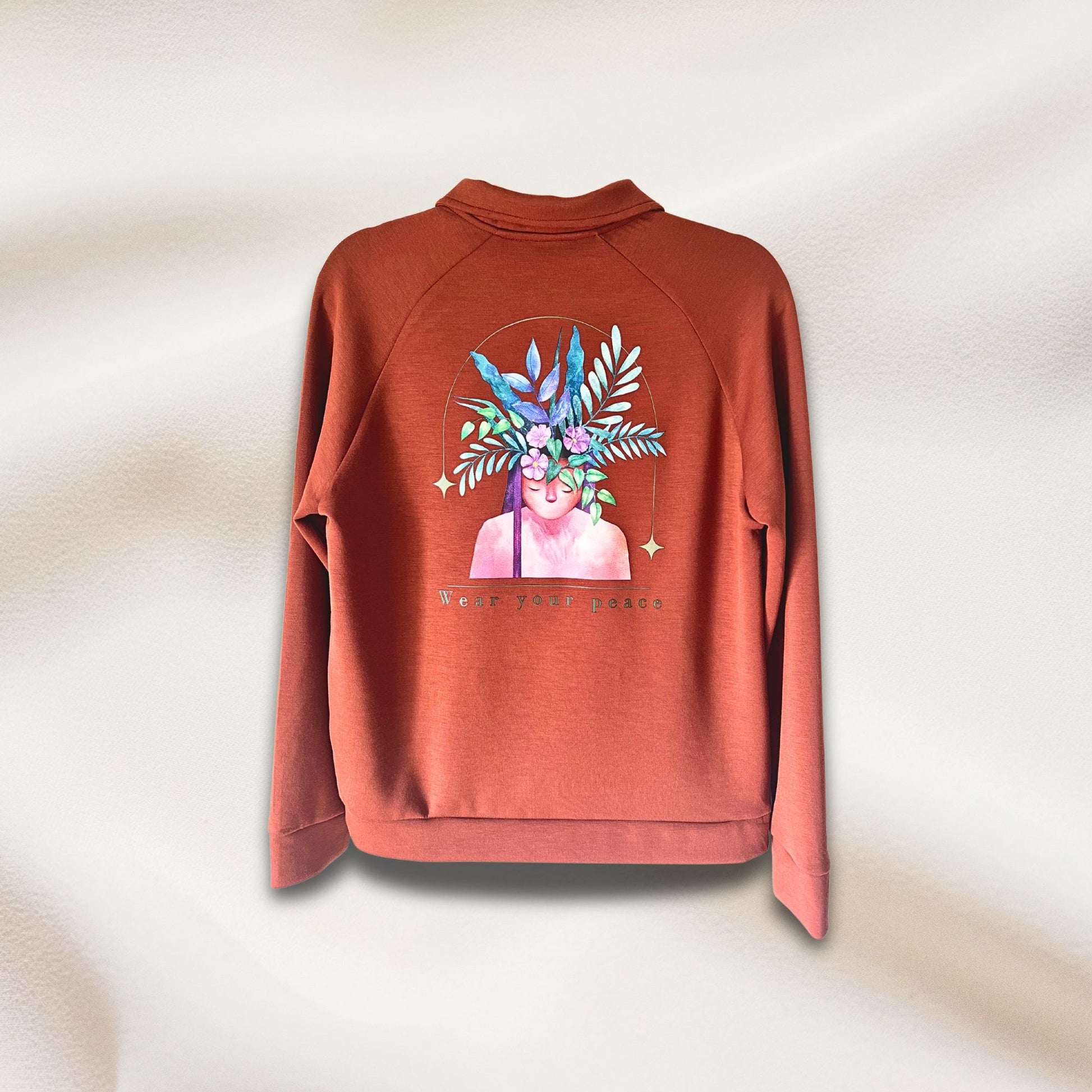 Its earthy terracotta color and gold vinyl details add warmth and presence, while the floral design on the back reminds you to reconnect with your inner peace. The front reads “Dandelion. my Mind. my Power”, and the back invites you: Wear your peace.