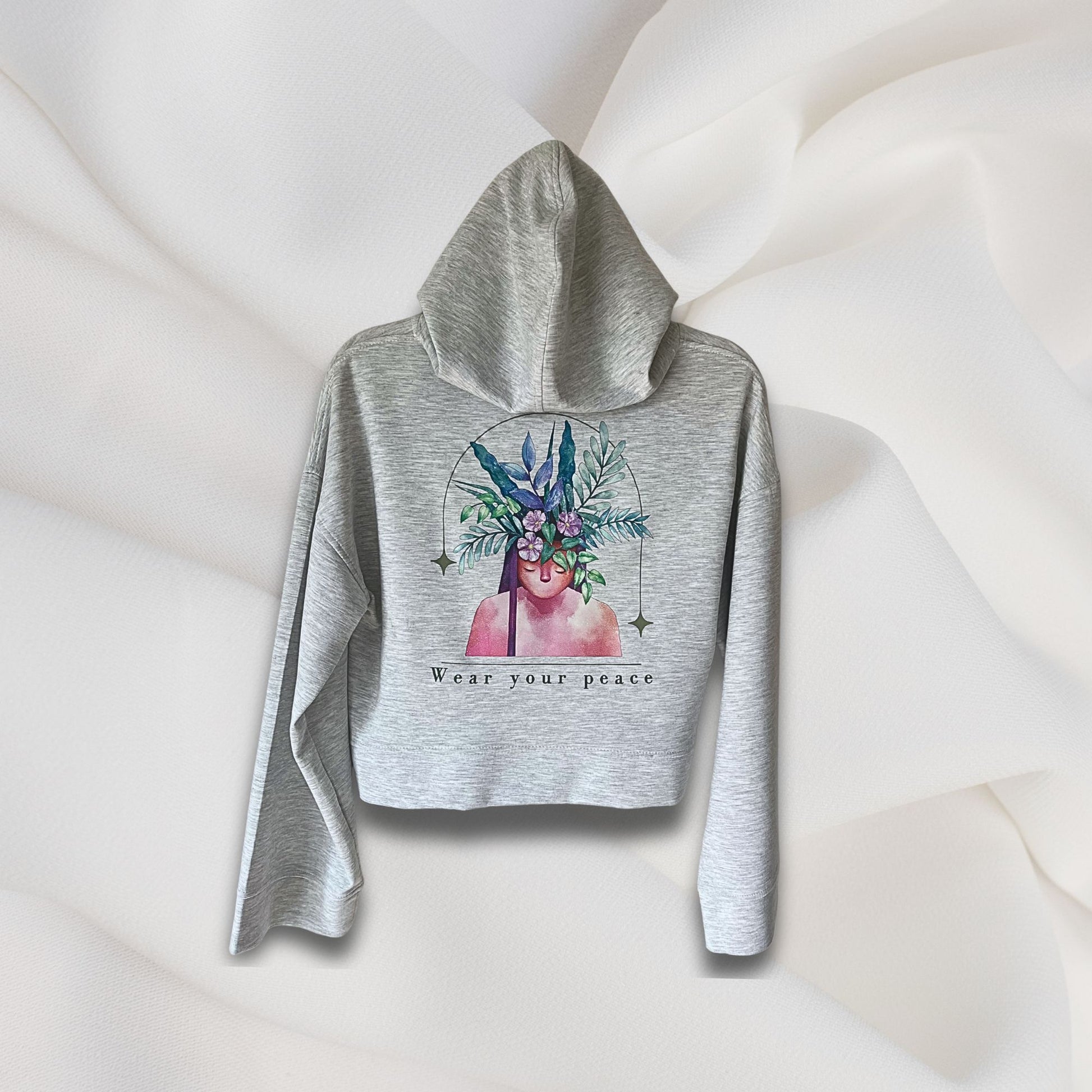 On the back, our signature floral artwork and the phrase “Wear your peace” invite you to carry softness and intention wherever you go.